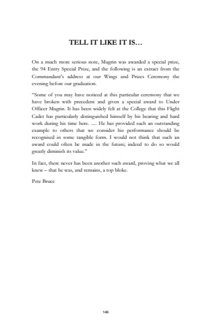 146TELL IT LIKE IT IS%u2026On a much more serious note, Mugrin was awarded a special prize, the 94 Entry Special Prize, and the following is an extract from the Commandant%u2019s address at our Wings and Prizes Ceremony the evening before our graduation. %u201cSome of you may have noticed at this particular ceremony that we have broken with precedent and given a special award to Under Officer Mugrin. It has been widely felt at the College that this Flight Cadet has particularly distinguished himself by his bearing and hard work during his time here. ..... He has provided such an outstanding example to others that we consider his performance should be recognised in some tangible form. I would not think that such an award could often be made in the future; indeed to do so would greatly diminish its value.%u201dIn fact, there never has been another such award, proving what we all knew %u2013 that he was, and remains, a top bloke. Pete Bruce