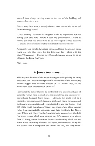 13ushered into a large meeting room at the end of the building and instructed to take a seat.After a very short wait, a smartly dressed man entered the room and the murmurings ceased.%u201cGood evening. My name is Knapper. I will be responsible for you during your stay here. Before I start my presentation, I want to remind you that you are all here to be Her Majesty%u2019s hired assassins %u2026 anyone who is uncomfortable with that should leave now!%u201dAmazingly, five people did indeed get up and leave the room. I never found out who they were, but the following day %u2013 along with the other 90 teenagers %u2013 I began my 30-month training course to be an officer in the Royal Air Force.Alan HarrisA Jones too many%u2026.This may not be one of the most riveting or side-splitting 94 Entry anecdotes, but I would be surprised if it wasn%u2019t one of the earliest; my records suggest that we were attested on 28th March 1966, so this would have been the afternoon of the 27th.I arrived at the Junior Mess to be confronted by a uniformed figure of authority (who, I have in mind, was the much-loved and impressivelybewhiskered Sergeant Chris Atyeo %u2013 although this could well be a figment of my imagination), bearing a clipboard. I gave my name, said clipboard was consulted, and I was directed to my new home %u2013 Hut 153 of the South Brick Lines. There I met some of my fellow-inmates (who, I am semi-reliably informed, were Pete Spofforth, Ian Nixey, John Wilson and Hugh Northey), and the hut%u2019s mentor, Len Marshall.For some reason which now escapes me, 94%u2019s mentors were drawn from 92 Entry, rather than from the next-senior entry which was the norm. I was shown my allocated bed-space, and unpacked all my kit.No sooner had I completed this when the late, and very-much-