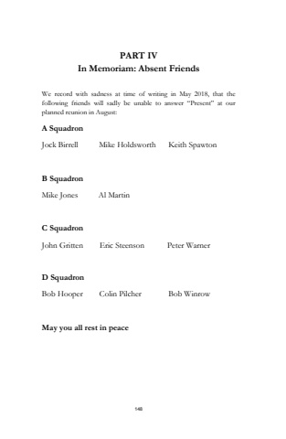 148PART IVIn Memoriam: Absent FriendsWe record with sadness at time of writing in May 2018, that the following friends will sadly be unable to answer %u201cPresent%u201d at our planned reunion in August:A SquadronJock Birrell Mike Holdsworth Keith SpawtonB SquadronMike Jones Al MartinC SquadronJohn Gritten Eric Steenson Peter WarnerD SquadronBob Hooper Colin Pilcher Bob WinrowMay you all rest in peace