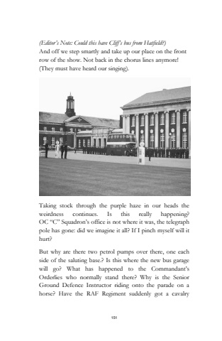 151(Editor%u2019s Note: Could this have Cliff%u2019s bus from Hatfield?) And off we step smartly and take up our place on the front row of the show. Not back in the chorus lines anymore! (They must have heard our singing).Taking stock through the purple haze in our heads the weirdness continues. Is this really happening?OC %u201cC%u201d Squadron%u2019s office is not where it was, the telegraph pole has gone: did we imagine it all? If I pinch myself will it hurt? But why are there two petrol pumps over there, one each side of the saluting base.? Is this where the new bus garage will go? What has happened to the Commandant%u2019s Orderlies who normally stand there? Why is the Senior Ground Defence Instructor riding onto the parade on a horse? Have the RAF Regiment suddenly got a cavalry