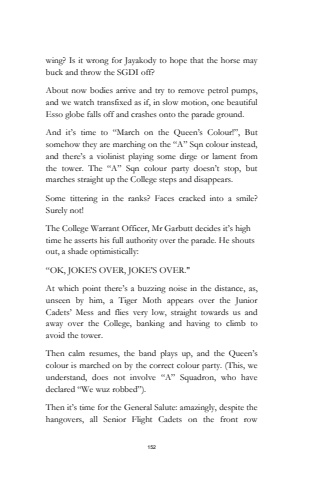 152wing? Is it wrong for Jayakody to hope that the horse may buck and throw the SGDI off?About now bodies arrive and try to remove petrol pumps, and we watch transfixed as if, in slow motion, one beautiful Esso globe falls off and crashes onto the parade ground.And it%u2019s time to %u201cMarch on the Queen%u2019s Colour!%u201d, But somehow they are marching on the %u201cA%u201d Sqn colour instead, and there%u2019s a violinist playing some dirge or lament from the tower. The %u201cA%u201d Sqn colour party doesn%u2019t stop, but marches straight up the College steps and disappears. Some tittering in the ranks? Faces cracked into a smile? Surely not! The College Warrant Officer, Mr Garbutt decides it%u2019s high time he asserts his full authority over the parade. He shoutsout, a shade optimistically: %u201cOK, JOKE'S OVER, JOKE'S OVER.\At which point there%u2019s a buzzing noise in the distance, as,unseen by him, a Tiger Moth appears over the Junior Cadets%u2019 Mess and flies very low, straight towards us and away over the College, banking and having to climb to avoid the tower.Then calm resumes, the band plays up, and the Queen%u2019s colour is marched on by the correct colour party. (This, we understand, does not involve %u201cA%u201d Squadron, who have declared %u201cWe wuz robbed%u201d).Then it%u2019s time for the General Salute: amazingly, despite the hangovers, all Senior Flight Cadets on the front row