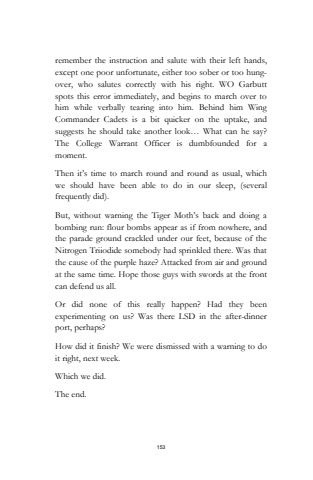 153remember the instruction and salute with their left hands, except one poor unfortunate, either too sober or too hungover, who salutes correctly with his right. WO Garbutt spots this error immediately, and begins to march over to him while verbally tearing into him. Behind him Wing Commander Cadets is a bit quicker on the uptake, and suggests he should take another look%u2026 What can he say? The College Warrant Officer is dumbfounded for a moment.Then it%u2019s time to march round and round as usual, which we should have been able to do in our sleep, (several frequently did). But, without warning the Tiger Moth%u2019s back and doing a bombing run: flour bombs appear as if from nowhere, and the parade ground crackled under our feet, because of the Nitrogen Triiodide somebody had sprinkled there. Was that the cause of the purple haze? Attacked from air and ground at the same time. Hope those guys with swords at the front can defend us all. Or did none of this really happen? Had they been experimenting on us? Was there LSD in the after-dinner port, perhaps?How did it finish? We were dismissed with a warning to do it right, next week.Which we did. The end.