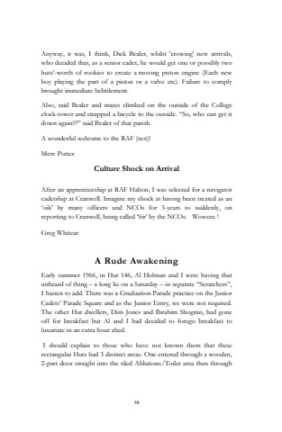 16Anyway, it was, I think, Dick Bealer, whilst 'crowing' new arrivals, who decided that, as a senior cadet, he would get one or possibly two huts%u2019-worth of rookies to create a moving piston engine (Each new boy playing the part of a piston or a valve etc). Failure to comply brought immediate belittlement.Also, said Bealer and mates climbed on the outside of the College clock-tower and strapped a bicycle to the outside. %u201cSo, who can get it down again??%u201d said Bealer of that parish.A wonderful welcome to the RAF (not)!Merv PotterCulture Shock on ArrivalAfter an apprenticeship at RAF Halton, I was selected for a navigator cadetship at Cranwell. Imagine my shock at having been treated as an %u2018oik%u2019 by many officers and NCOs for 3-years to suddenly, on reporting to Cranwell, being called %u2018Sir%u2019 by the NCOs. Woweee !Greg WhitearA Rude AwakeningEarly summer 1966, in Hut 146, Al Holman and I were having that unheard of thing %u2013 a long lie on a Saturday %u2013 in separate %u201cScratchers%u201d, I hasten to add. There was a Graduation Parade practice on the Junior Cadets%u2019 Parade Square and as the Junior Entry, we were not required. The other Hut dwellers, Dim Jones and Ibrahim Shogran, had gone off for breakfast but Al and I had decided to forego breakfast to luxuriate in an extra hour abed.I should explain to those who have not known them that these rectangular Huts had 3 distinct areas. One entered through a wooden, 2-part door straight into the tiled Ablutions/Toilet area then through
