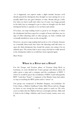 19As it happened, our captors made a slight mistake because we'd already passed the checkpoint they thought we were aiming for so we actually didn't lose any great distance or time. Morale did get a little low when we had to pull each other out of some very boggy ground in the dark, but we managed to get to what we thought was the final checkpoint before it opened, so we sat there and waited.Of course, our map reading wasn't as good as we thought, so when the checkpoint had been open for a couple of hours and there was no sign of either directing staff or other groups, we had a rethink and eventually decided we were on the wrong hill.However, our poor map-reading had saved us a lot of hassle, because we eventually discovered that when the directing staff did arrive to open the final checkpoint they found the enemy was using it for an ambush spot. The enemy had to move away, but had we really arrived at the checkpoint earlier we would have been captured again. Merv PotterWhen is a River not a River?For the Escape and Evasion phase of Exercise King Rock in Germany, we were divided into 4-men groups and driven about 20 miles, given a map and a compass and the coordinates of RDV 1 where we would be given the coordinates of RDV 2 and subsequently RDV 3 and then %u201chome%u201d. A regiment of the British Army had orders to stop us reaching the RDV points and to %u201carrest%u201d us. Our group was composed of Ibrahim Shogran, our Jordanian Air Force chum, a Maltese Sandhurst Cadet, Mike Dixon and me. Shoggy we knew as very strong but not always quick to catch on. We were soon to realise that the Maltese lad was overweight and lazy. Mike and I, both in the College Athletics and Cross-Country teams, were very fit.
