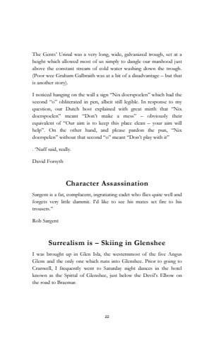 22The Gents%u2019 Urinal was a very long, wide, galvanized trough, set at a height which allowed most of us simply to dangle our manhood just above the constant stream of cold water washing down the trough. (Poor wee Graham Galbraith was at a bit of a disadvantage %u2013 but that is another story).I noticed hanging on the wall a sign %u201cNix doerspoelen%u201d which had the second %u201co%u201d obliterated in pen, albeit still legible. In response to my question, our Dutch host explained with great mirth that %u201cNix doerspoelen%u201d meant %u201cDon%u2019t make a mess%u201d %u2013 obviously their equivalent of %u201cOur aim is to keep this place clean %u2013 your aim will help%u201d. On the other hand, and please pardon the pun, %u201cNix doerspelen%u201d without that second %u201co%u201d meant %u201cDon%u2019t play with it%u201d. %u2018Nuff said, really. David ForsythCharacter AssassinationSargent is a fat, complacent, ingratiating cadet who flies quite well and forgets very little dammit. I%u2019d like to see his mates set fire to his trousers.%u201dRob SargentSurrealism is %u2013 Skiing in GlensheeI was brought up in Glen Isla, the westernmost of the five Angus Glens and the only one which runs into Glenshee. Prior to going to Cranwell, I frequently went to Saturday night dances in the hotel known as the Spittal of Glenshee, just below the Devil%u2019s Elbow on the road to Braemar.