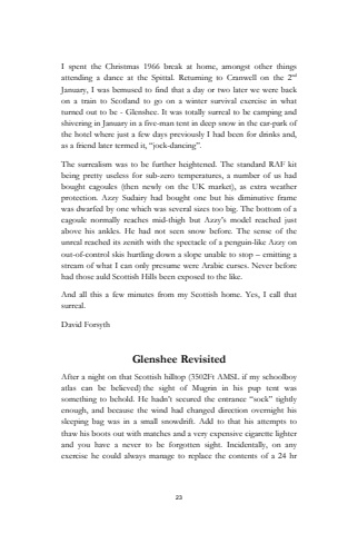 23I spent the Christmas 1966 break at home, amongst other things attending a dance at the Spittal. Returning to Cranwell on the 2ndJanuary, I was bemused to find that a day or two later we were back on a train to Scotland to go on a winter survival exercise in what turned out to be - Glenshee. It was totally surreal to be camping and shivering in January in a five-man tent in deep snow in the car-park of the hotel where just a few days previously I had been for drinks and, as a friend later termed it, %u201cjock-dancing%u201d.The surrealism was to be further heightened. The standard RAF kit being pretty useless for sub-zero temperatures, a number of us had bought cagoules (then newly on the UK market), as extra weather protection. Azzy Sudairy had bought one but his diminutive frame was dwarfed by one which was several sizes too big. The bottom of a cagoule normally reaches mid-thigh but Azzy%u2019s model reached just above his ankles. He had not seen snow before. The sense of the unreal reached its zenith with the spectacle of a penguin-like Azzy on out-of-control skis hurtling down a slope unable to stop %u2013 emitting a stream of what I can only presume were Arabic curses. Never before had those auld Scottish Hills been exposed to the like.And all this a few minutes from my Scottish home. Yes, I call that surreal. David ForsythGlenshee RevisitedAfter a night on that Scottish hilltop (3502Ft AMSL if my schoolboy atlas can be believed) the sight of Mugrin in his pup tent was something to behold. He hadn%u2019t secured the entrance %u201csock%u201d tightly enough, and because the wind had changed direction overnight his sleeping bag was in a small snowdrift. Add to that his attempts to thaw his boots out with matches and a very expensive cigarette lighter and you have a never to be forgotten sight. Incidentally, on any exercise he could always manage to replace the contents of a 24 hr