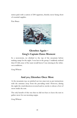 24ration pack with a carton of 200 cigarettes, thereby never being short of essential supplies.Pete BruceGlenshee Again %u2013 Greg%u2019s Captain Oates MomentIn a snowstorm, we climbed to the top of the mountain before making camp for the night. I was last in the group. I suddenly realisedthat if I fell, none of the team would know I was missing in the whiteout conditions. Greg WhitearAnd yes, Glenshee Once MoreAt the mountain top, we pitched our two-man tent as per instructions with the entrance away from the prevailing wind. However, during the night the wind direction reversed and we awoke to about a foot of snow inside the tent. The only benefit of this was that we did not have to leave the tent to gather snow for our morning cuppa.Greg Whitear