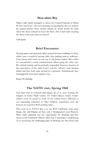 25Shoe-shine BoyFlight Cadet Spink managed to annoy his Corporal batman in Block 80 (not sure how) %u2013 the next morning on opening his door to retrieve his airman pattern shoes freshly shined, he nearly breaks his back when the shoes refused to leave the floor. The 6-inch nails securing the shoes took some time to remove!Cliff SpinkBrief EncounterHeating pipes and electrical cables passed between buildings in ducts which were covered by paving slabs thus making narrow walkways. Tony Stacey and I were on our way to the Junior Cadets%u2019 Mess when we encountered a newly commissioned officer going the other way. We saluted smartly and he promptly responded; however, because of the narrowness of the path Tony%u2019s and the officer%u2019s arms became linked and they both spun around in a pirouette. Embarrassed, they disengaged & went their separate ways.Roger Wooldridge The NATO visit, Spring 1968Our final term at Cranwell had begun; all of us were wearing the insignia of Senior Flight Cadets. Or Under-officers, Senior Underofficers even. So proud we were of our exalted status, oblivious to our impending reduction to Pilot Officers, somewhere near the bottom of everyone%u2019s RAF pecking order. They took us to NATO, that is to say, RAF Laarbruch, some army things, the odd Belgian air base and a Headquarters near Brussels. What really appealed was the opportunity for drinking duty-free booze in the Laarbruch Officer%u2019s Mess bar. I remember a small group of us conceiving the challenging plan of drinking one shot from each