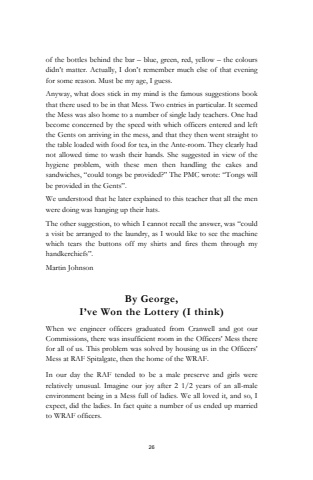 26of the bottles behind the bar %u2013 blue, green, red, yellow %u2013 the colours didn%u2019t matter. Actually, I don%u2019t remember much else of that evening for some reason. Must be my age, I guess.Anyway, what does stick in my mind is the famous suggestions book that there used to be in that Mess. Two entries in particular. It seemed the Mess was also home to a number of single lady teachers. One had become concerned by the speed with which officers entered and left the Gents on arriving in the mess, and that they then went straight to the table loaded with food for tea, in the Ante-room. They clearly had not allowed time to wash their hands. She suggested in view of the hygiene problem, with these men then handling the cakes and sandwiches, %u201ccould tongs be provided?%u201d The PMC wrote: %u201cTongs will be provided in the Gents%u201d.We understood that he later explained to this teacher that all the men were doing was hanging up their hats.The other suggestion, to which I cannot recall the answer, was %u201ccould a visit be arranged to the laundry, as I would like to see the machine which tears the buttons off my shirts and fires them through my handkerchiefs%u201d.Martin JohnsonBy George,I%u2019ve Won the Lottery (I think)When we engineer officers graduated from Cranwell and got our Commissions, there was insufficient room in the Officers%u2019 Mess there for all of us. This problem was solved by housing us in the Officers%u2019 Mess at RAF Spitalgate, then the home of the WRAF. In our day the RAF tended to be a male preserve and girls were relatively unusual. Imagine our joy after 2 1/2 years of an all-male environment being in a Mess full of ladies. We all loved it, and so, I expect, did the ladies. In fact quite a number of us ended up married to WRAF officers.
