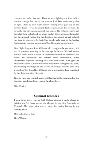 28comes in at a rather fast rate. There we were lighting our fuses, which was fine, except that one of our number, Rich Bolt, could not get his to light. Ours by now were merrily hissing away, just like in the cowboy films! Try as he might, Rich could not get his to burn. By now, the sea was lapping around our ankles. The solution was to cut his safety fuse in half and try again. Luckily this was successful and at last they ignited. Cutting the fuse length in two meant we had reduced our time to take cover by half. Our steady walk back to the bunker had suddenly become a most un-officer like sprint up the beach.Our Flight Sergeant, Ron Williams, old enough to be our father, left we 20 year-olds standing in the race up the beach. We had almost reached cover when a series of explosions behind us confirmed the stores had detonated and several metal ammunition boxes disappeared skywards heading for a low earth orbit. What goes up must come down. One lid was on its way down, falling back to earth, and looming ever larger by the second. It thudded into the sand only a couple of feet from Ron Williams who was standing there transfixed by this demonstration of gravity.Gravity gave way to mirth and we all laughed at the outcome, but the laughing was distinctly nervous at the close shave.Mike DaviesCriminal OffencesI went from three years at RAF Halton without a single charge to holding the 94 Entry record for charges in my first 3-months at Cranwell. The high point was a charge for having laundry in my laundry basket. How ridiculous is that!Greg Whitear