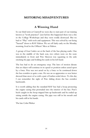 31MOTORING MISADVENTURESA Winning HandIn our third term at Cranwell we were due to start part of our training known as \in the College Workshops and they were totally destroyed. But we had to %u201cPlay%u201d with tools and equipment. This was solved by our being %ussed\morning, lived in the Officers%u2019 Mess at Halton. A group of four Cadets sat at the back of the bus playing cards. One was in the middle of the back seat, two others were on the seats immediately in front and Pete Slawson was squatting in the aisle smoking his pipe and holding his cards in his left hand. The bus had to do an emergency stop. The laws of motion dictate that an object will continue in its speed or position unless acted upon by a force. Pete was not acted on by a force so he continued down the bus corridor at quite a rate. He was an ex-apprentice so was better dressed than most of us with a pair of leather-soled shoes. To this day I can remember the sight of Pete sliding down the bus corridor backwards.It is worth adding that the standard RAF bus had a hoop protecting the engine casing that protruded into the interior of the bus. Pete's heels caught in the hoop tripped him up backwards and he ended up sitting astride the engine casing. His pipe was still in his mouth and his cards still in his hands.The late Colin Pilcher