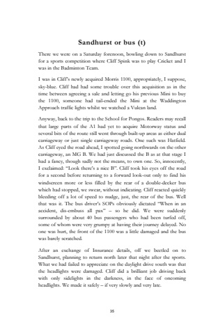 35Sandhurst or bus (t)There we were on a Saturday forenoon, bowling down to Sandhurst for a sports competition where Cliff Spink was to play Cricket and I was in the Badminton Team.I was in Cliff%u2019s newly acquired Morris 1100, appropriately, I suppose, sky-blue. Cliff had had some trouble over this acquisition as in the time between agreeing a sale and letting go his previous Mini to buy the 1100, someone had tail-ended the Mini at the Waddington Approach traffic lights whilst we watched a Vulcan land. Anyway, back to the trip to the School for Pongos. Readers may recall that large parts of the A1 had yet to acquire Motorway status and several bits of the route still went through built-up areas as either dual carriageway or just single carriageway roads. One such was Hatfield. As Cliff eyed the road ahead, I spotted going northwards on the other carriageway, an MG B. We had just discussed the B as at that stage I had a fancy, though sadly not the means, to own one. So, innocently,I exclaimed: %u201cLook there%u2019s a nice B%u201d. Cliff took his eyes off the roadfor a second before returning to a forward look-out only to find his windscreen more or less filled by the rear of a double-decker bus which had stopped, we swear, without indicating. Cliff reacted quickly bleeding off a lot of speed to nudge, just, the rear of the bus. Well that was it. The bus driver%u2019s SOPs obviously dictated %u201cWhen in an accident, dis-embuss all pax%u201d %u2013 so he did. We were suddenly surrounded by about 40 bus passengers who had been turfed off, some of whom were very grumpy at having their journey delayed. No one was hurt, the front of the 1100 was a little damaged and the bus was barely scratched. After an exchange of Insurance details, off we beetled on to Sandhurst, planning to return north later that night after the sports. What we had failed to appreciate on the daylight drive south was that the headlights were damaged. Cliff did a brilliant job driving back with only sidelights in the darkness, in the face of oncoming headlights. We made it safely %u2013 if very slowly and very late.