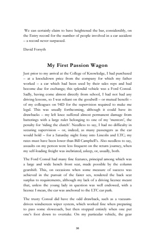 36We can certainly claim to have heightened the bar, considerably, on the Entry record for the number of people involved in a car accident %u2013 a record never surpassed. David ForsythMy First Passion WagonJust prior to my arrival at the College of Knowledge, I had purchased %u2013 at a knockdown price from the company for which my father worked %u2013 a car which had been used by their sales reps and had become due for exchange; this splendid vehicle was a Ford Consul.Sadly, having come almost directly from school, I had not had any driving lessons, so I was reliant on the goodwill %u2013 or mutual benefit %u2013of my colleagues on 94D for the supervision required to make me legal. This was usually forthcoming, although it could have its drawbacks %u2013 my left knee suffered almost permanent damage from batterings with a large ruler belonging to one of my %u2018mentors%u2019, the penalty for %u2018riding the clutch%u2019. Needless to say, I had no difficulty in securing supervision %u2013 or, indeed, as many passengers as the car would hold %u2013 for a Saturday night foray into Lincoln and LTC; my rates must have been lower than Bill Campbell%u2019s. Also needless to say, assaults on my person were less frequent on the return journey, when my self-loading freight was inebriated, asleep, or, usually, both.The Ford Consul had many fine features, principal among which was a large and wide bench front seat, made possible by the column gearshift. This, on occasions when some measure of success was achieved in the pursuit of the fairer sex, rendered the back seat surplus to requirements, although my lack of a driving licence meant that, unless the young lady in question was well endowed, with a licence I mean, the car was anchored to the LTC car park. The trusty Consul did have the odd drawback, such as a vacuumdriven windscreen wiper system, which worked fine when preparing to pass some slowcoach, but then stopped entirely when one put one%u2019s foot down to overtake. On my particular vehicle, the gear