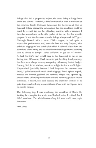 37linkage also had a propensity to jam, the cause being a dodgy bush under the bonnet. However, a brief conversation with a mechanic at the good Mr Chell%u2019s Motoring Emporium for the Down at Heel in Cranwell Village elicited the information that this condition could be cured by a swift tap on the offending junction with a hammer; I therefore carried one in the side pocket of the car, for this specific purpose. It was also fortunate that the linkage always stuck in 2nd gear.Although blessed with a mere 1703cc engine, it had quite a respectable performance and, since the box was only 3-speed, with judicious slippage of the clutch (for which I claimed a bye from the attentions of the ruler), the car would comfortably go from a standing start to about 40-50mph%u2013 quite sufficient to get out of trouble. As luck (or Sod%u2019s Law) would have it, this happened to me on my driving test. Of course, I had meant to get the thing fixed properly, but there were always so many competing calls on my limited budget.Anyway, Sod, in his wisdom, struck on a slight incline at traffic lights.Unperturbed (probably because I had forgotten the examiner was there), I pulled away with much clutch slippage, found a place to park, released the bonnet, grabbed the hammer, nipped out, opened up, thwacked the offending mechanism with the hammer, got back in and continued. I passed, not least because the examiner seemed to be quite impressed with my resourcefulness, if not with my 3-point turn or parallel parking.The following day, I was wandering the corridors of Block 80, looking for a co-pilot for a trip into Sleaford, when I realised that I didn%u2019t need one! The rehabilitation of my left knee could now begin in earnest%u2026Dim Jones