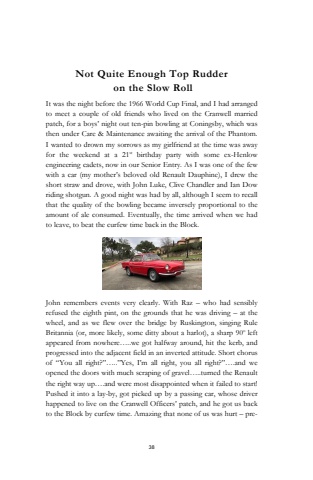 38Not Quite Enough Top Rudderon the Slow RollIt was the night before the 1966 World Cup Final, and I had arranged to meet a couple of old friends who lived on the Cranwell married patch, for a boys%u2019 night out ten-pin bowling at Coningsby, which was then under Care & Maintenance awaiting the arrival of the Phantom. I wanted to drown my sorrows as my girlfriend at the time was away for the weekend at a 21st birthday party with some ex-Henlow engineering cadets, now in our Senior Entry. As I was one of the few with a car (my mother%u2019s beloved old Renault Dauphine), I drew the short straw and drove, with John Luke, Clive Chandler and Ian Dow riding shotgun. A good night was had by all, although I seem to recall that the quality of the bowling became inversely proportional to the amount of ale consumed. Eventually, the time arrived when we had to leave, to beat the curfew time back in the Block. John remembers events very clearly. With Raz %u2013 who had sensibly refused the eighth pint, on the grounds that he was driving %u2013 at the wheel, and as we flew over the bridge by Ruskington, singing Rule Britannia (or, more likely, some ditty about a harlot), a sharp 90o left appeared from nowhere%u2026..we got halfway around, hit the kerb, and progressed into the adjacent field in an inverted attitude. Short chorus of %u201cYou all right?%u201d%u2026..%u201dYes, I%u2019m all right, you all right?%u201d%u2026.and we opened the doors with much scraping of gravel%u2026..turned the Renault the right way up%u2026.and were most disappointed when it failed to start!Pushed it into a lay-by, got picked up by a passing car, whose driver happened to live on the Cranwell Officers%u2019 patch, and he got us back to the Block by curfew time. Amazing that none of us was hurt %u2013 pre-