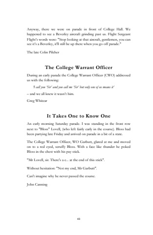 43Anyway, there we were on parade in front of College Hall. We happened to see a Beverley aircraft grinding past us. Flight Sergeant Flight%u2019s words were: \see it%u2019s a Beverley, it'll still be up there when you go off parade.\The late Colin Pilcher The College Warrant OfficerDuring an early parade the College Warrant Officer (CWO) addressed us with the following:%u2018I call you %u2018Sir%u2019 and you call me %u2018Sir%u2019 but only one of us means it%u2019 %u2013 and we all knew it wasn%u2019t him. Greg WhitearIt Takes One to Know OneAn early morning Saturday parade. I was standing in the front row next to \been partying late Friday and arrived on parade in a bit of a state.The College Warrant Officer, WO Garbutt, glared at me and moved on to a red eyed, scruffy Bloss. With a face like thunder he poked Bloss in the chest with his pay stick.\ Lovell, sir. There's a c... at the end of this stick\Without hesitation: \Can't imagine why he never passed the course.John Canning