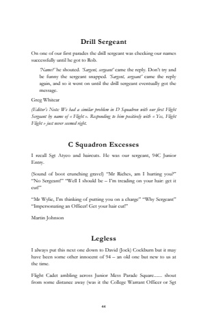 44Drill SergeantOn one of our first parades the drill sergeant was checking our names successfully until he got to Rob. %u2018Name?%u2019 he shouted. %u2018Sargent, sergeant%u2019 came the reply. Don%u2019t try and be funny the sergeant snapped. %u2018Sargent, sergeant%u2019 came the reply again, and so it went on until the drill sergeant eventually got the message.Greg Whitear(Editor%u2019s Note: We had a similar problem in D Squadron with our first Flight Sergeant by name of %u00ab Flight %u00bb. Responding to him positively with %u00ab Yes, Flight Flight %u00bb just never seemed right.C Squadron ExcessesI recall Sgt Atyeo and haircuts. He was our sergeant, 94C Junior Entry.(Sound of boot crunching gravel) %u201cMr Riches, am I hurting you?%u201d %u201cNo Sergeant!%u201d %u201cWell I should be %u2013 I%u2019m treading on your hair: get it cut!%u201d%u201cMr Wylie, I%u2019m thinking of putting you on a charge%u201d %u201cWhy Sergeant%u201d %u201cImpersonating an Officer! Get your hair cut!%u201dMartin JohnsonLeglessI always put this next one down to David (Jock) Cockburn but it may have been some other innocent of 94 %u2013 an old one but new to us at the time. Flight Cadet ambling across Junior Mess Parade Square....... shout from some distance away (was it the College Warrant Officer or Sgt