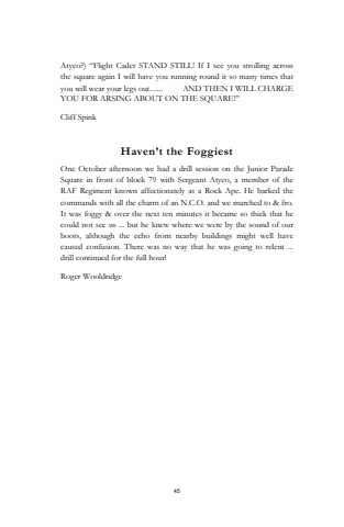 45Atyeo?) %u201cFlight Cadet STAND STILL! If I see you strolling across the square again I will have you running round it so many times that you will wear your legs out....... AND THEN I WILL CHARGE YOU FOR ARSING ABOUT ON THE SQUARE!%u201dCliff SpinkHaven%u2019t the FoggiestOne October afternoon we had a drill session on the Junior Parade Square in front of block 79 with Sergeant Atyeo, a member of the RAF Regiment known affectionately as a Rock Ape. He barked the commands with all the charm of an N.C.O. and we marched to & fro. It was foggy & over the next ten minutes it became so thick that he could not see us ... but he knew where we were by the sound of our boots, although the echo from nearby buildings might well have caused confusion. There was no way that he was going to relent ...drill continued for the full hour! Roger Wooldridge