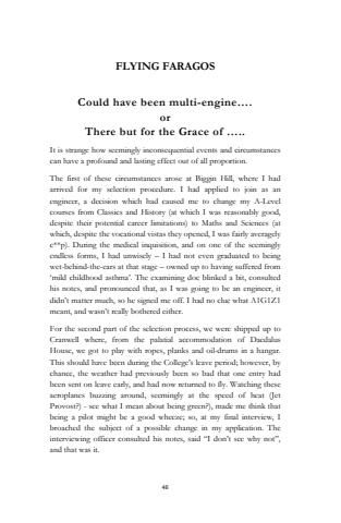 46FLYING FARAGOSCould have been multi-engine%u2026. or There but for the Grace of %u2026..It is strange how seemingly inconsequential events and circumstances can have a profound and lasting effect out of all proportion.The first of these circumstances arose at Biggin Hill, where I had arrived for my selection procedure. I had applied to join as an engineer, a decision which had caused me to change my A-Level courses from Classics and History (at which I was reasonably good, despite their potential career limitations) to Maths and Sciences (at which, despite the vocational vistas they opened, I was fairly averagely c**p). During the medical inquisition, and on one of the seemingly endless forms, I had unwisely %u2013 I had not even graduated to being wet-behind-the-ears at that stage %u2013 owned up to having suffered from %u2018mild childhood asthma%u2019. The examining doc blinked a bit, consulted his notes, and pronounced that, as I was going to be an engineer, it didn%u2019t matter much, so he signed me off. I had no clue what A1G1Z1 meant, and wasn%u2019t really bothered either.For the second part of the selection process, we were shipped up to Cranwell where, from the palatial accommodation of Daedalus House, we got to play with ropes, planks and oil-drums in a hangar.This should have been during the College%u2019s leave period; however, by chance, the weather had previously been so bad that one entry had been sent on leave early, and had now returned to fly. Watching these aeroplanes buzzing around, seemingly at the speed of heat (Jet Provost?) - see what I mean about being green?), made me think that being a pilot might be a good wheeze; so, at my final interview, I broached the subject of a possible change in my application. The interviewing officer consulted his notes, said %u201cI don%u2019t see why not%u201d, and that was it.