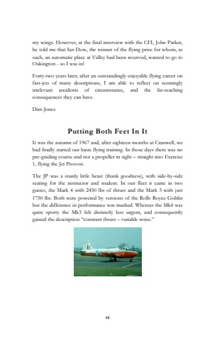 48my wings. However, at the final interview with the CFI, John Parker, he told me that Ian Dow, the winner of the flying prize for whom, as such, an automatic place at Valley had been reserved, wanted to go to Oakington - so I was in!Forty-two years later, after an outstandingly enjoyable flying career on fast-jets of many descriptions, I am able to reflect on seemingly irrelevant accidents of circumstance, and the far-reaching consequences they can have.Dim JonesPutting Both Feet In ItIt was the autumn of 1967 and, after eighteen months at Cranwell, we had finally started our basic flying training. In those days there was no pre-grading course and not a propeller in sight %u2013 straight into Exercise 1, flying the Jet Provost.The JP was a sturdy little beast (thank goodness), with side-by-side seating for the instructor and student. In our fleet it came in two guises, the Mark 4 with 2450 lbs of thrust and the Mark 3 with just 1750 lbs. Both were powered by versions of the Rolls Royce Goblin but the difference in performance was marked. Whereas the Mk4 was quite sporty the Mk3 felt distinctly less urgent, and consequently gained the description %u201cconstant thrust %u2013 variable noise.%u201d
