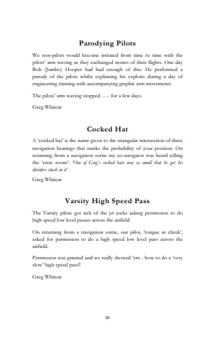 50Parodying Pilots We non-pilots would become irritated from time to time with the pilots%u2019 arm waving as they exchanged stories of their flights. One day Bob (Jumbo) Hooper had had enough of this. He performed a parody of the pilots whilst explaining his exploits during a day of engineering training with accompanying graphic arm movements. The pilots%u2019 arm waving stopped %u2026.. for a few days.Greg WhitearCocked HatA %u2018cocked hat%u2019 is the name given to the triangular intersection of three navigation bearings that marks the probability of your position. On returning from a navigation sortie my co-navigator was heard telling the %u2018crew room%u2019: %u2018One of Greg%u2019s cocked hats was so small that he got his dividers stuck in it%u2019.Greg WhitearVarsity High Speed PassThe Varsity pilots got sick of the jet jocks asking permission to do high speed low level passes across the airfield. On returning from a navigation sortie, our pilot, %u2018tongue in cheek%u2019, asked for permission to do a high speed low level pass across the airfield. Permission was granted and we really showed %u2018em - how to do a %u2018very slow%u2019 high speed pass!! Greg Whitear