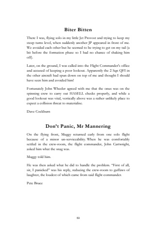 53Biter BittenThere I was, flying solo in my little Jet Provost and trying to keep my steep turns level, when suddenly another JP appeared in front of me.We avoided each other but he seemed to be trying to get on my tail (a bit before the formation phase so I had no chance of shaking him off).Later, on the ground, I was called into the Flight Commander's office and accused of keeping a poor lookout. Apparently the 2 Sqn QFI in the other aircraft had spun down on top of me and thought I should have seen him and avoided him!Fortunately John Wheeler agreed with me that the onus was on the spinning crew to carry out HASELL checks properly, and while a good lookout was vital, vertically above was a rather unlikely place to expect a collision threat to materialise.Dave CockburnDon%u2019t Panic, Mr ManneringOn the flying front, Muggy returned early from one solo flight because of a minor un-serviceability. When he was comfortably settled in the crew-room, the flight commander, John Cartwright, asked him what the snag was.Muggy told him.He was then asked what he did to handle the problem. %u201cFirst of all, sir, I panicked%u201d was his reply, reducing the crew-room to guffaws of laughter, the loudest of which came from said flight commander.Pete Bruce