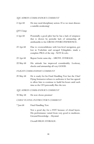 55SQUADRON COMMANDER%u2019S COMMENT2 Apr 68 He may need disciplinary action. If so we must discuss a suitable awakening!QFI Change4 Apr 68 Potentially a good pilot but he has a lack of crispness that is shown by periodic lack of airmanship, all attributable to his GROSS OVERCONFIDENCE.23 Apr 68 Due to overconfidence with low-level navigation, got lost in Yorkshire and savaged Fylingdales. made a complete PIGS of the trip - NOT fit solo.23 Apr 68 Repeat Sortie same day - ABOVE AVERAGE.22 May 68 His attitude has improved considerably. Lookout, checks and airmanship all very GOOD.FLIGHT COMMANDER%u2019S COMMENT29 May 68 He is ready for his Final Handling Test but the Chief Flying Instructor refuses to authorise it: but has agreed to allow him to continue to build his hours until such time as the CFI personally flies the test.SQUADRON COMMANDER%u2019S COMMENT30 May 68 He now shows promise!CHIEF FLYING INSTRUCTOR%u2019S COMMENT7 Jun 68 Final Handling Test.Not a good day for a FHT because of cloud layers. His performance varied from very good to mediocre. Ground Knowledge - Abysmal.Overall HIGH AVERAGE.