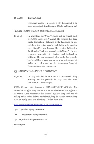 5624 Jun 68 Trapper CheckPromising aviator. He needs to fly the aircraft a bit more aggressively for this stage. Thinks well in the air!FLIGHT COMMANDERS COURSE ASSESSMENT26 Jul 68 He completes his %u2018Wings%u2019 Course with an overall mark of 70.61% (just High Average). His progress has been erratic throughout -believing at the beginning he was only here for a few months and didn%u2019t really need to exert himself to get through. He certainly believed in the idea that %u201cJack was as good as his Master%u201d. He was extremely resentful of criticism and inclined to sulkiness. He has improved a lot in the last monthsbut he still has a long way to go both to improve his ability as a pilot and to take instruction from his Instructors without resentment.SQUADRON COMMANDER%u2019S COMMENT30 Jul 68 He may still feel he is a SUO at Advanced Flying Training and it%u2019s possible he may have the same problems as 3 months ago!Within 10 years, after becoming a %u2018CREAMED-OFF%u2019 QFI first, Rob obtained an A2 QFI rating, was an IRE on the Phantom and then a QWI on the Hunter. Upon retirement he had achieved 10,000+ flying, both with the military and an airline, before a final flourish flying the Hawker Hunter during 2014 air-display season (Pre-Shoreham). The link below refers:https://www.youtube.com/watch?v=7h-aHhyOKzUQFI - Qualified Flying InstructorIRE - Instrument rating ExaminerQWI - Qualified Weapons InstructorRob Sargent