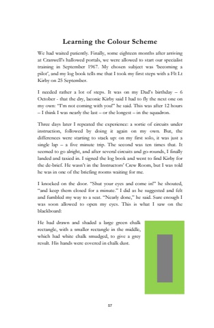 57Learning the Colour SchemeWe had waited patiently. Finally, some eighteen months after arriving at Cranwell%u2019s hallowed portals, we were allowed to start our specialist training in September 1967. My chosen subject was %u2018becoming a pilot%u2019, and my log book tells me that I took my first steps with a Flt Lt Kirby on 25 September.I needed rather a lot of steps. It was on my Dad%u2019s birthday %u2013 6 October - that the dry, laconic Kirby said I had to fly the next one on my own: %u201cI%u2019m not coming with you!%u201d he said. This was after 12 hours %u2013 I think I was nearly the last %u2013 or the longest %u2013 in the squadron.Three days later I repeated the experience: a sortie of circuits under instruction, followed by doing it again on my own. But, the differences were starting to stack up: on my first solo, it was just a single lap %u2013 a five minute trip. The second was ten times that. It seemed to go alright, and after several circuits and go-rounds, I finally landed and taxied in. I signed the log book and went to find Kirby for the de-brief. He wasn%u2019t in the Instructors%u2019 Crew Room, but I was told he was in one of the briefing rooms waiting for me.I knocked on the door. %u201cShut your eyes and come in!%u201d he shouted, %u201cand keep them closed for a minute.%u201d I did as he suggested and felt and fumbled my way to a seat. %u201cNearly done,%u201d he said. Sure enough I was soon allowed to open my eyes. This is what I saw on the blackboard:He had drawn and shaded a large green chalk rectangle, with a smaller rectangle in the middle, which had white chalk smudged, to give a grey result. His hands were covered in chalk dust.