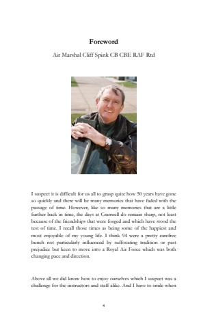 4ForewordAir Marshal Cliff Spink CB CBE RAF RtdI suspect it is difficult for us all to grasp quite how 50 years have gone so quickly and there will be many memories that have faded with the passage of time. However, like so many memories that are a little further back in time, the days at Cranwell do remain sharp, not least because of the friendships that were forged and which have stood the test of time. I recall those times as being some of the happiest and most enjoyable of my young life. I think 94 were a pretty carefree bunch not particularly influenced by suffocating tradition or past prejudice but keen to move into a Royal Air Force which was both changing pace and direction. Above all we did know how to enjoy ourselves which I suspect was a challenge for the instructors and staff alike. And I have to smile when