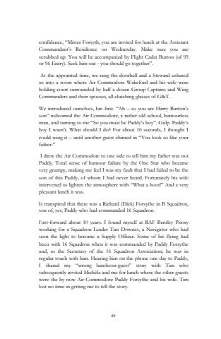 61confidence, %u201cMister Forsyth, you are invited for lunch at the Assistant Commandant%u2019s Residence on Wednesday. Make sure you are scrubbed up. You will be accompanied by Flight Cadet Burton (of 95 or 96 Entry). Seek him out - you should go together%u201d.At the appointed time, we rang the doorbell and a Steward ushered us into a room where Air Commodore Wakeford and his wife were holding court surrounded by half a dozen Group Captains and Wing Commanders and their spouses, all clutching glasses of G&T.We introduced ourselves, Ian first. %u201cAh %u2013 so you are Harry Burton%u2019s son%u201d welcomed the Air Commodore, a rather old school, humourless man, and turning to me %u201cSo you must be Paddy%u2019s boy%u201d. Gulp. Paddy%u2019s boy I wasn%u2019t. What should I do? For about 10 seconds, I thought I could wing it %u2013 until another guest chimed in %u201cYou look so like your father.%u201dI drew the Air Commodore to one side to tell him my father was not Paddy. Total sense of humour failure by the One Star who becamevery grumpy, making me feel I was my fault that I had failed to be the son of this Paddy, of whom I had never heard. Fortunately his wife intervened to lighten the atmosphere with %u201cWhat a hoot!%u201d And a very pleasant lunch it was.It transpired that there was a Richard (Dick) Forsythe in B Squadron, son of, yes, Paddy who had commanded 16 Squadron.Fast-forward about 10 years. I found myself at RAF Bentley Priory working for a Squadron Leader Tim Downes, a Navigator who had seen the light to become a Supply Officer. Some of his flying had been with 16 Squadron when it was commanded by Paddy Forsythe and, as the Secretary of the 16 Squadron Association; he was in regular touch with him. Hearing him on the phone one day to Paddy, I shared my %u201cwrong luncheon-guest%u201d story with Tim who subsequently invited Mich%u00e8le and me for lunch where the other guests were the by now Air Commodore Paddy Forsythe and his wife. Tim lost no time in getting me to tell the story.