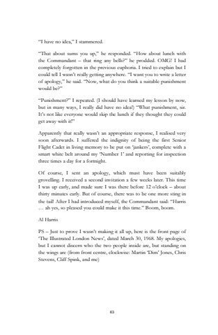 63%u201cI have no idea,%u201d I stammered.%u201cThat about sums you up,%u201d he responded. %u201cHow about lunch with the Commandant %u2013 that ring any bells?%u201d he prodded. OMG! I had completely forgotten in the previous euphoria. I tried to explain but I could tell I wasn%u2019t really getting anywhere. %u201cI want you to write a letter of apology,%u201d he said. %u201cNow, what do you think a suitable punishment would be?%u201d%u201cPunishment?%u201d I repeated. (I should have learned my lesson by now, but in many ways, I really did have no idea!) %u201cWhat punishment, sir. It%u2019s not like everyone would skip the lunch if they thought they could get away with it!%u201dApparently that really wasn%u2019t an appropriate response, I realised very soon afterwards. I suffered the indignity of being the first Senior Flight Cadet in living memory to be put on %u2018jankers%u2019, complete with a smart white belt around my %u2018Number 1%u2019 and reporting for inspection three times a day for a fortnight.Of course, I sent an apology, which must have been suitably grovelling. I received a second invitation a few weeks later. This time I was up early, and made sure I was there before 12 o%u2019clock %u2013 about thirty minutes early. But of course, there was to be one more sting in the tail! After I had introduced myself, the Commandant said: %u201cHarris %u2026 ah yes, so pleased you could make it this time.%u201d Boom, boom.Al HarrisPS %u2013 Just to prove I wasn%u2019t making it all up, here is the front page of %u2018The Illustrated London News%u2019, dated March 30, 1968. My apologies, but I cannot discern who the two people inside are, but standing on the wings are (from front centre, clockwise: Martin %u2018Dim%u2019 Jones, Chris Stevens, Cliff Spink, and me)