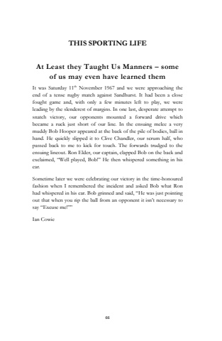 66THIS SPORTING LIFEAt Least they Taught Us Manners %u2013 some of us may even have learned themIt was Saturday 11th November 1967 and we were approaching the end of a tense rugby match against Sandhurst. It had been a close fought game and, with only a few minutes left to play, we were leading by the slenderest of margins. In one last, desperate attempt to snatch victory, our opponents mounted a forward drive which became a ruck just short of our line. In the ensuing melee a very muddy Bob Hooper appeared at the back of the pile of bodies, ball in hand. He quickly slipped it to Clive Chandler, our scrum half, who passed back to me to kick for touch. The forwards trudged to the ensuing lineout. Ron Elder, our captain, clapped Bob on the back and exclaimed, %u201cWell played, Bob!%u201d He then whispered something in his ear.Sometime later we were celebrating our victory in the time-honoured fashion when I remembered the incident and asked Bob what Ron had whispered in his ear. Bob grinned and said, %u201cHe was just pointing out that when you rip the ball from an opponent it isn%u2019t necessary to say %u201cExcuse me!%u201d%u201d Ian Cowie