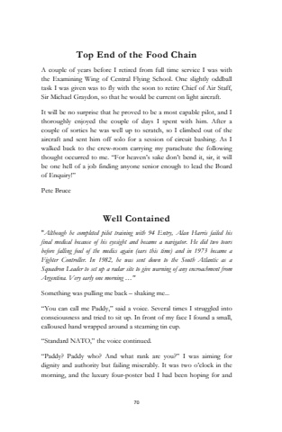 70Top End of the Food ChainA couple of years before I retired from full time service I was with the Examining Wing of Central Flying School. One slightly oddball task I was given was to fly with the soon to retire Chief of Air Staff, Sir Michael Graydon, so that he would be current on light aircraft.It will be no surprise that he proved to be a most capable pilot, and I thoroughly enjoyed the couple of days I spent with him. After a couple of sorties he was well up to scratch, so I climbed out of the aircraft and sent him off solo for a session of circuit bashing. As I walked back to the crew-room carrying my parachute the following thought occurred to me. %u201cFor heaven%u2019s sake don%u2019t bend it, sir, it will be one hell of a job finding anyone senior enough to lead the Board of Enquiry!%u201dPete BruceWell Contained\ he completed pilot training with 94 Entry, Alan Harris failed his final medical because of his eyesight and became a navigator. He did two tours before falling foul of the medics again (ears this time) and in 1973 became a Fighter Controller. In 1982, he was sent down to the South Atlantic as a Squadron Leader to set up a radar site to give warning of any encroachment from Argentina. Very early one morning %u2026\Something was pulling me back %u2013 shaking me... %u201cYou can call me Paddy,%u201d said a voice. Several times I struggled into consciousness and tried to sit up. In front of my face I found a small, calloused hand wrapped around a steaming tin cup. %u201cStandard NATO,%u201d the voice continued.%u201cPaddy? Paddy who? And what rank are you?%u201d I was aiming for dignity and authority but failing miserably. It was two o%u2019clock in the morning, and the luxury four-poster bed I had been hoping for and