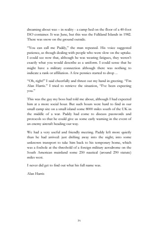 71dreaming about was %u2013 in reality - a camp bed on the floor of a 40-foot ISO container. It was June, but this was the Falkland Islands in 1982. There was snow on the ground outside.%u201cYou can call me Paddy,%u201d the man repeated. His voice suggested patience, as though dealing with people who were slow on the uptake. I could see now that, although he was wearing fatigues, they weren%u2019t exactly what you would describe as a uniform. I could sense that he might have a military connection although there was nothing to indicate a rank or affiliation. A few pennies started to drop ... %u201cOh, right!%u201d I said cheerfully and thrust out my hand in greeting. %u201cI%u2019m Alan Harris.%u201d I tried to retrieve the situation, %u201cI%u2019ve been expecting you.%u201dThis was the guy my boss had told me about, although I had expected him at a more social hour. But such hours were hard to find in our small camp site on a small island some 8000 miles south of the UK in the middle of a war. Paddy had come to discuss passwords and protocols so that he could give us some early warning in the event of an enemy aircraft heading our way. We had a very useful and friendly meeting. Paddy left more quietly than he had arrived: just drifting away into the night; into some unknown transport to take him back to his temporary home, which was a foxhole at the threshold of a foreign military aerodrome on the South American mainland some 250 nautical (around 290 statute) miles west.I never did get to find out what his full name was.Alan Harris