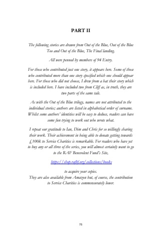 75PART IIThe following stories are drawn from Out of the Blue, Out of the Blue Too and Out of the Blue, The Final landing. All were penned by members of 94 Entry. For those who contributed just one story, it appears here. Some of those who contributed more than one story specified which one should appear here. For those who did not choose, I drew from a hat their story which is included here. I have included two from Cliff as, in truth, they are two parts of the same tale.As with the Out of the Blue trilogy, names are not attributed to the individual stories; authors are listed in alphabetical order of surname. Whilst some authors%u2019 identities will be easy to deduce, readers can have some fun trying to work out who wrote what.I repeat our gratitude to Ian, Dim and Chris for so willingly sharing their work. Their achievement in being able to donate getting towards %u00a3100k to Service Charities is remarkable. For readers who have yet to buy any or all three of the series, you will almost certainly want to goto the RAF Benevolent Fund%u2019s Site,https://shop.rafbf.org/collections/booksto acquire your copies. They are also available from Amazon but, of course, the contribution to Service Charities is commensurately lower.