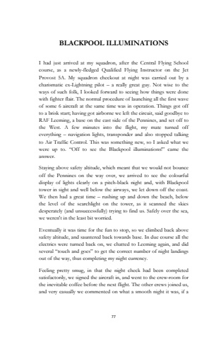 77BLACKPOOL ILLUMINATIONSI had just arrived at my squadron, after the Central Flying School course, as a newly-fledged Qualified Flying Instructor on the Jet Provost 5A. My squadron checkout at night was carried out by a charismatic ex-Lightning pilot %u2013 a really great guy. Not wise to the ways of such folk, I looked forward to seeing how things were done with fighter flair. The normal procedure of launching all the first wave of some 6 aircraft at the same time was in operation. Things got off to a brisk start; having got airborne we left the circuit, said goodbye to RAF Leeming, a base on the east side of the Pennines, and set off to the West. A few minutes into the flight, my mate turned off everything %u2013 navigation lights, transponder and also stopped talking to Air Traffic Control. This was something new, so I asked what we were up to. %u201cOff to see the Blackpool illuminations!%u201d came the answer.Staying above safety altitude, which meant that we would not bounce off the Pennines on the way over, we arrived to see the colourful display of lights clearly on a pitch-black night and, with Blackpool tower in sight and well below the airways, we let down off the coast. We then had a great time %u2013 rushing up and down the beach, below the level of the searchlight on the tower, as it scanned the skies desperately (and unsuccessfully) trying to find us. Safely over the sea, we weren't in the least bit worried.Eventually it was time for the fun to stop, so we climbed back above safety altitude, and sauntered back towards base. In due course all the electrics were turned back on, we chatted to Leeming again, and did several %u201ctouch and goes%u201d to get the correct number of night landings out of the way, thus completing my night currency.Feeling pretty smug, in that the night check had been completed satisfactorily, we signed the aircraft in, and went to the crew-room for the inevitable coffee before the next flight. The other crews joined us, and very casually we commented on what a smooth night it was, if a