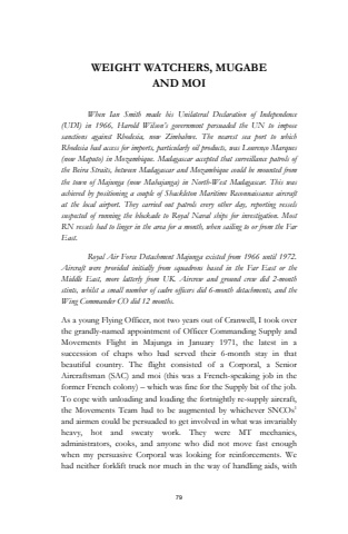 79WEIGHT WATCHERS, MUGABE AND MOIWhen Ian Smith made his Unilateral Declaration of Independence (UDI) in 1966, Harold Wilson%u2019s government persuaded the UN to impose sanctions against Rhodesia, now Zimbabwe. The nearest sea port to which Rhodesia had access for imports, particularly oil products, was Louren%u00e7o Marques (now Maputo) in Mozambique. Madagascar accepted that surveillance patrols of the Beira Straits, between Madagascar and Mozambique could be mounted from the town of Majunga (now Mahajanga) in North-West Madagascar. This was achieved by positioning a couple of Shackleton Maritime Reconnaissance aircraft at the local airport. They carried out patrols every other day, reporting vessels suspected of running the blockade to Royal Naval ships for investigation. Most RN vessels had to linger in the area for a month, when sailing to or from the Far East. Royal Air Force Detachment Majunga existed from 1966 until 1972. Aircraft were provided initially from squadrons based in the Far East or the Middle East, more latterly from UK. Aircrew and ground crew did 2-month stints, whilst a small number of cadre officers did 6-month detachments, and the Wing Commander CO did 12 months.As a young Flying Officer, not two years out of Cranwell, I took over the grandly-named appointment of Officer Commanding Supply and Movements Flight in Majunga in January 1971, the latest in a succession of chaps who had served their 6-month stay in that beautiful country. The flight consisted of a Corporal, a Senior Aircraftsman (SAC) and moi (this was a French-speaking job in the former French colony) %u2013 which was fine for the Supply bit of the job. To cope with unloading and loading the fortnightly re-supply aircraft, the Movements Team had to be augmented by whichever SNCOs1and airmen could be persuaded to get involved in what was invariably heavy, hot and sweaty work. They were MT mechanics, administrators, cooks, and anyone who did not move fast enough when my persuasive Corporal was looking for reinforcements. We had neither forklift truck nor much in the way of handling aids, with
