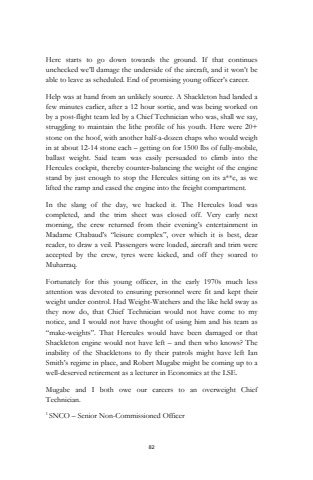 82Herc starts to go down towards the ground. If that continues unchecked we%u2019ll damage the underside of the aircraft, and it won%u2019t be able to leave as scheduled. End of promising young officer%u2019s career.Help was at hand from an unlikely source. A Shackleton had landed a few minutes earlier, after a 12 hour sortie, and was being worked on by a post-flight team led by a Chief Technician who was, shall we say, struggling to maintain the lithe profile of his youth. Here were 20+ stone on the hoof, with another half-a-dozen chaps who would weigh in at about 12-14 stone each %u2013 getting on for 1500 lbs of fully-mobile, ballast weight. Said team was easily persuaded to climb into the Hercules cockpit, thereby counter-balancing the weight of the engine stand by just enough to stop the Hercules sitting on its a**e, as we lifted the ramp and eased the engine into the freight compartment.In the slang of the day, we hacked it. The Hercules load was completed, and the trim sheet was closed off. Very early next morning, the crew returned from their evening%u2019s entertainment in Madame Chabaud%u2019s %u201cleisure complex%u201d, over which it is best, dear reader, to draw a veil. Passengers were loaded, aircraft and trim were accepted by the crew, tyres were kicked, and off they soared to Muharraq. Fortunately for this young officer, in the early 1970s much less attention was devoted to ensuring personnel were fit and kept their weight under control. Had Weight-Watchers and the like held sway as they now do, that Chief Technician would not have come to my notice, and I would not have thought of using him and his team as %u201cmake-weights%u201d. That Hercules would have been damaged or that Shackleton engine would not have left %u2013 and then who knows? The inability of the Shackletons to fly their patrols might have left Ian Smith%u2019s regime in place, and Robert Mugabe might be coming up to a well-deserved retirement as a lecturer in Economics at the LSE.Mugabe and I both owe our careers to an overweight Chief Technician.1 SNCO %u2013 Senior Non-Commissioned Officer