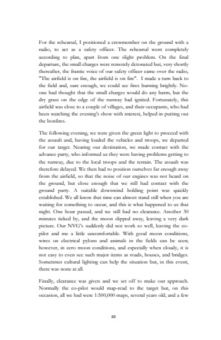 85For the rehearsal, I positioned a crewmember on the ground with a radio, to act as a safety officer. The rehearsal went completely according to plan, apart from one slight problem. On the final departure, the small charges were remotely detonated but, very shortly thereafter, the frantic voice of our safety officer came over the radio, \ airfield is on fire, the airfield is on fire\I made a turn back to the field and, sure enough, we could see fires burning brightly. Noone had thought that the small charges would do any harm, but the dry grass on the edge of the runway had ignited. Fortunately, this airfield was close to a couple of villages, and their occupants, who had been watching the evening's show with interest, helped in putting out the bonfires.The following evening, we were given the green light to proceed with the assault and, having loaded the vehicles and troops, we departed for our target. Nearing our destination, we made contact with the advance party, who informed us they were having problems getting to the runway, due to the local troops and the terrain. The assault was therefore delayed. We then had to position ourselves far enough away from the airfield, so that the noise of our engines was not heard on the ground, but close enough that we still had contact with the ground party. A suitable downwind holding point was quickly established. We all know that time can almost stand still when you are waiting for something to occur, and this is what happened to us that night. One hour passed, and we still had no clearance. Another 30 minutes ticked by, and the moon slipped away, leaving a very dark picture. Our NVG%u2019s suddenly did not work so well, leaving the copilot and me a little uncomfortable. With good moon conditions, wires on electrical pylons and animals in the fields can be seen; however, in zero moon conditions, and especially when cloudy, it is not easy to even see such major items as roads, houses, and bridges.Sometimes cultural lighting can help the situation but, in this event, there was none at all.Finally, clearance was given and we set off to make our approach.Normally the co-pilot would map-read to the target but, on this occasion, all we had were 1:500,000 maps, several years old, and a few