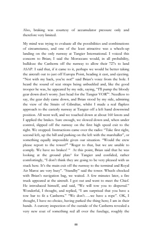 88Also, braking was courtesy of accumulator pressure only and therefore very limited. My mind was trying to evaluate all the possibilities and combinations of circumstance, and one of the least attractive was a wheels-up landing on the only runway at Tangier International. I voiced this concern to Brian; I said the Moroccans would, in all probability, bulldoze the Canberra off the runway to allow their 727s to land ASAP. I said that, if it came to it, perhaps we would be better taking the aircraft out to just off Europa Point, heading it east, and ejecting. %u201cNot with my back, you%u2019re not!%u201d said Brian%u2019s voice from the hole. I heard the sound of seat straps being unbuckled and, like the good trooper he was, he appeared by my side, saying, %u201cI%u2019ll pump the bloody gear down don%u2019t worry. Just head for the Tangier VOR2%u201d. Needless to say, the gear duly came down, and Brian stood by my side, admiring the view of the Straits of Gibraltar, whilst I made a real flapless approach to the easterly runway at Tangier off a left hand downwind position. All went well, and we touched down at about 160 knots and I applied the brakes. Sure enough, we slowed down and, when under control, slipped off the runway on the first high speed exit to the right. We stopped. Instructions came over the radio: %u201cTake first right, second left, up the hill and parking on the left with the marshaller%u201d, or something equally impossible given our situation. %u201cWould the crew please report to the tower?\comply. We have no brakes! %u201c At this point, Brian said that he was looking at the ground plate3 for Tangier and confided, rather comfortingly, %u201cI don%u2019t think they are going to be very pleased with us stuck here. It%u2019s the main exit off the runway to the terminal and Royal Air Maroc are very busy%u201d. %u201cStandby%u201d said the tower. Wheels chocked with Brian%u2019s navigation bag, we waited. A few minutes later, a fire truck appeared at the aircraft. I got out and went to meet the Chief.He introduced himself, and said, %u201cWe will tow you to dispersal.%u201dWonderful, I thought, and replied, %u201cI am surprised that you have a tow bar to fit a Canberra.%u201d %u201cWe don%u2019t%u2026..we have a rope%u201d. OK, I thought, I have no choice, having parked the thing here; I am in their hands. A cursory inspection of the outside of the Canberra revealed a very new coat of something red all over the fuselage, roughly the