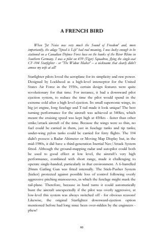 93A FRENCH BIRDWhen 'Jet Noise was very much the Sound of Freedom' and, more importantly, the adage 'Speed is Life' had real meaning, I was lucky enough to be stationed on a Canadian Defence Force base on the banks of the River Rhine in Southern Germany. I was a pilot on 439 (Tiger) Squadron, flying the single-seat CF-104 Starfighter - or 'The Widow Maker' %u2013 a nickname that clearly didn't amuse my wife at all! Starfighter pilots loved the aeroplane for its simplicity and raw power.Designed by Lockheed as a high-level interceptor for the United States Air Force in the 1950s, certain design features were quite revolutionary for that time. For instance, it had a downward pilot ejection system, to reduce the time the pilot would spend in the extreme cold after a high level ejection. Its small supersonic wings, its big jet engine, long fuselage and T-tail made it look unique! The best turning performance for the aircraft was achieved at 540kts, which meant the cruising speed was kept high at 450kts - faster than other strike/attack aircraft of the time. Because the wings were so thin, no fuel could be carried in them, just in fuselage tanks and tip tanks; under-wing pylon tanks could be carried for ferry flights. The 104 didn't possess a Radar Altimeter or Moving Map Display but, in the mid-1980s, it did have a third-generation Inertial Nav/Attack System fitted. Although the ground-mapping radar and autopilot could both be used to good effect at low level, the aircraft%u2019s very high performance, combined with short range, made it challenging to operate single-handed, particularly in that environment. A 6-barrelled 20mm Gatling Gun was fitted internally. The Stick-Pusher System (kicker) protected against possible loss of control following overly aggressive pitching manoeuvres, in which the fuselage might mask the tail-plane. Therefore, because in hard turns it could automatically bunt the aircraft unexpectedly if the pilot was overly aggressive, at low-level this system was always switched off - for obvious reasons!Likewise, the original Starfighter downward-ejection option mentioned before had long since been over-ridden by the engineers -phew!