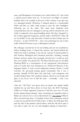 95away, and Bremgarten in Germany was a little further off - but it had a nuclear power plant close by. As low-level over-flight of nuclear facilities had to be avoided at all costs, I felt it unwise to go that way in a damaged aircraft. Therefore, I reduced speed to a comfortable 360kt and flew an orbit, while trying to raise the first Starfighter following me on the radio. The wind noise hindered clear communication, but we managed to join up, and he checked me over while I conducted a low speed handling check. We then %u2018chopped%u2019 to the Colmar approach frequency, and he made a MAYDAY1-relay call on my behalf. It was only then that I found out that Colmar was on Exercise %u2013 in fact TACEVAL2 %u2013 they were practising for war; I then really wished I'd chosen to go to Bremgarten instead! My colleague escorted me in for my landing and saw me touchdown, before heading home. I cleared the runway, and taxied behind the follow-me truck to parking. I was met by a group of armed guards in full Nuclear, Biological and Chemical protective clothing, wearing helmets and gas masks; they promptly arrested me. I could see that they were clearly %u2018very pissed-off.%u2019 The Base had been put on Air Raid Warning RED as a consequence of my unexpected visit/intrusion and, as a result, they were treating me as a 'Defector'! Because of the language barrier, it took several unpleasant minutes before I could convince the gas-mask-wearing guard commander that I was a genuine, friendly NATO pilot who had had a real emergency and needed medical help. The smashed window, blood on my hands and glass in my boots sort of did the trick %u2013 eventually %u2013 and I was released!After the %u201cAll Clear%u201d was given from air attack, the medics kindly stitched me up and then, about an hour later, the RAF Exchange Officer at Colmar appeared (someone I had last seen over 10 years before during flying training). After contacting my Squadron back at Baden, he took me for a very civilized lunch in a very empty Officers' Mess. Several hours later, a Canadian Forces Huey helicopter arrived to pick me up and fly the 60 miles home. At Base, the helicopter flew past the side of the primary school where, with the side door open, I was able to pick out my son and daughter playing at break-time -