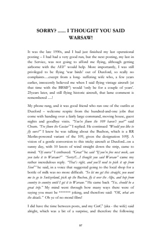 97SORRY? ...... I THOUGHT YOU SAID WARSAW!It was the late 1990s, and I had just finished my last operational posting %u2013 I had had a very good run, but the next posting, my last in the Service, was not going to afford me flying, although getting airborne with the AEF1 would help. More importantly, I was still privileged to be flying %u2018war birds%u2019 out of Duxford, so really no complaints.....except from a long- suffering wife who, a few years earlier, innocently believed me when I said flying vintage aircraft (at that time with the BBMF2) would %u2018only be for a couple of years%u2019.25years later, and still flying historic aircraft, that lame comment is remembered .....!My phone rang, and it was good friend who ran one of the outfits at Duxford %u2013 welcome respite from the hundred-and-one jobs that come with handing over a fairly large command, moving house, guest nights and goodbye visits. %u201cYou%u2019ve flown the 109 haven%u2019t you?%u201d said Chum. %u201cI%u2019ve flown the Gustav3%u201d I replied. He continued %u201cWould you like to fly ours?%u201d I knew he was talking about the Buchon, which is a RR Merlin-powered variant of the 109, given the designation 109J. A vision of a gentle conversion to this tricky aircraft at Duxford...on a sunny day, with 10 knots of wind straight down the strip, came to mind. %u201cOf course%u201d I enthused. %u201cGreat%u201d he said %u201cIf you%u2019re free next week, can you take it to Warsaw?%u201d %u201cSorry?!....I thought you said Warsaw%u201d came my rather incredulous reply. %u201cThat%u2019s right, and you%u2019ll need to pick it up from Sion4%u201d he said, in a voice that suggested going to the local shop for a bottle of milk was no more difficult. %u201cSo let me get this straight, you want me to go to Switzerland, pick up the Buchon, fly it over the Alps, and hop from country to country until I get it to Warsaw.%u201d He came back %u201cYes, should be a great trip.%u201d My mind went through how many ways there were of saying you must be ******* joking, and therefore said: %u201cOK, what are the details.%u201d Oh ye of no moral fibre!I did have the time between posts, and my CinC5 (aka - the wife) said alright, which was a bit of a surprise, and therefore the following