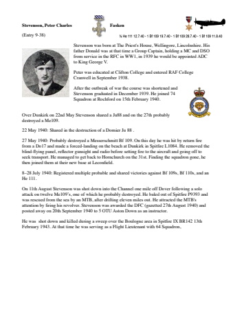 Stevenson, Peter Charles Fasken(Entry 9-38)Stevenson was born at The Priest's House, Wellingore, Lincolnshire. His father Donald was at that time a Group Captain, holding a MC and DSO from service in the RFC in WW1, in 1939 he would be appointed ADC to King George V.Peter was educated at Clifton College and entered RAF College Cranwell in September 1938.After the outbreak of war the course was shortened and Stevenson graduated in December 1939. He joined 74 Squadron at Rochford on 15th February 1940.Over Dunkirk on 22nd May Stevenson shared a Ju88 and on the 27th probably destroyed a Me109.22 May 1940: Shared in the destruction of a Dornier Ju 88 .27 May 1940: Probably destroyed a Messerschmitt Bf 109. On this day he was hit by return fire from a Do17 and made a forced-landing on the beach at Dunkirk in Spitfire L1084. He removed the blind-flying panel, reflector gunsight and radio before setting fire to the aircraft and going off to seek transport. He managed to get back to Hornchurch on the 31st. Finding the squadron gone, he then joined them at their new base at Leconfield. 8%u201328 July 1940: Registered multiple probable and shared victories against Bf 109s, Bf 110s, and an He 111.On 11th August Stevenson was shot down into the Channel one mile off Dover following a solo attack on twelve Me109%u2019s, one of which he probably destroyed. He baled out of Spitfire P9393 and was rescued from the sea by an MTB, after drifting eleven miles out. He attracted the MTB's attention by firing his revolver. Stevenson was awarded the DFC (gazetted 27th August 1940) and posted away on 20th September 1940 to 5 OTU Aston Down as an instructor. He was shot down and killed during a sweep over the Boulogne area in Spitfire IX BR142 13th February 1943. At that time he was serving as a Flight Lieutenant with 64 Squadron,