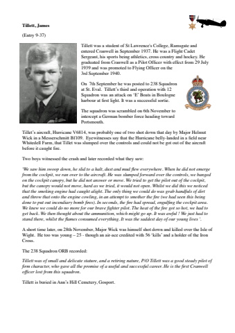 Tillett, James(Entry 9-37)Tillett was a student of St Lawrence's College, Ramsgate and entered Cranwell in September 1937. He was a Flight Cadet Sergeant, his sports being athletics, cross country and hockey. He graduated from Cranwell as a Pilot Officer with effect from 29 July1939 and was promoted to Flying Officer on the 3rd September 1940.On 7th September he was posted to 238 Squadron at St. Eval. Tillett%u2019s third and operation with 12 Squadron was an attack on %u2018E%u2019 Boats in Boulogne harbour at first light. It was a successful sortie.The squadron was scrambled on 6th November to intercept a German bomber force heading toward Portsmouth.%u00a0%u00a0Tillet%u2019s aircraft, Hurricane V6814, was probably one of two shot down that day by Major Helmut Wick in a Messerschmitt Bf109.%u00a0%u00a0Eyewitnesses say that the Hurricane belly-landed in a field near Whitedell Farm, that Tillet was slumped over the controls and could not be got out of the aircraft before it caught fire.Two boys witnessed the crash and later recorded what they sa'We saw him swoop down, he slid to a halt, dust and mud flew everywhere. When he did not emerge from the cockpit, we ran over to the aircraft. He was slumped forward over the controls, we banged on the cockpit canopy, but he did not answer or move. We tried to get the pilot out of the cockpit, but the canopy would not move, hard as we tried, it would not open. Whilst we did this we noticed that the smoking engine had caught alight. The only thing we could do was grab handfuls of dirt and throw that onto the engine cowling, in an attempt to smother the fire (we had seen this being done to put out incendiary bomb fires). In seconds, the fire had spread, engulfing the cockpit area. We knew we could do no more for our brave fighter pilot. The heat of the fire got so hot, we had to get back. We then thought about the ammunition, which might go up. It was awful ! We just had to stand there, whilst the flames consumed everything. It was the saddest day of our young lives '.A short time later, on 28th November, Major Wick was himself shot down and killed over the Isle of Wight.%u00a0%u00a0He too was young %u2013 25 - though an air-ace credited with 56 %u2018kills%u2019 and a holder of the Iron Cross.The 238 Squadron ORB recorded:Tillett was of small and delicate stature, and a retiring nature, P/O Tillett was a good steady pilot of firm character, who gave all the promise of a useful and successful career. He is the first Cranwell officer lost from this squadron. Tillett is buried in Ann%u2019s Hill Cemetery, Gosport.