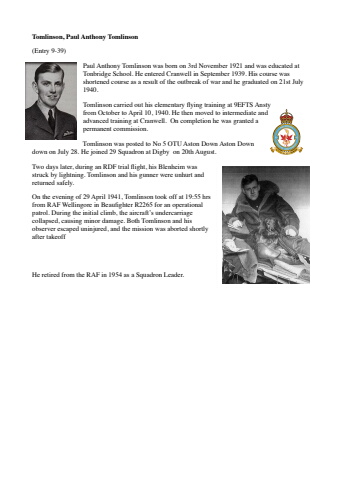 Tomlinson, Paul Anthony Tomlinson(Entry 9-39)Paul Anthony Tomlinson was born on 3rd November 1921 and was educated at Tonbridge School. He entered Cranwell in September 1939. His course was shortened course as a result of the outbreak of war and he graduated on 21st July 1940.Tomlinson carried out his elementary flying training at 9EFTS Ansty from October to April 10, 1940. He then moved to intermediate and advanced training at Cranwell. On completion he was granted a permanent commission. Tomlinson was posted to No 5 OTU Aston Down Aston Down down on July 28. He joined 29 Squadron at Digby on 20th August.Two days later, during an RDF trial flight, his Blenheim was struck by lightning. Tomlinson and his gunner were unhurt and returned safely.On the evening of 29 April 1941, Tomlinson took off at 19:55 hrs from RAF Wellingore in Beaufighter R2265 for an operational patrol. During the initial climb, the aircraft%u2019s undercarriage collapsed, causing minor damage. Both Tomlinson and his observer escaped uninjured, and the mission was aborted shortly after takeoffHe retired from the RAF in 1954 as a Squadron Leader.%u00a0%u00a0