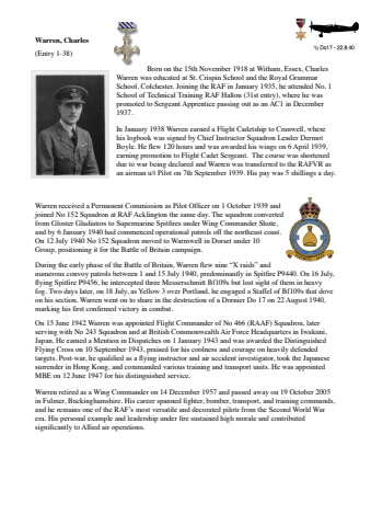 Warren, Charles(Entry 1-38)Born on the 15th November 1918 at Witham, Essex, Charles Warren was educated at St. Crispin School and the Royal Grammar School, Colchester. Joining the RAF in January 1935, he attended No. 1 School of Technical Training RAF Halton (31st entry), where he was promoted to Sergeant Apprentice passing out as an AC1 in December 1937.In January 1938 Warren earned a Flight Cadetship to Cranwell, where his logbook was signed by Chief Instructor Squadron Leader Dermot Boyle. He flew 120 hours and was awarded his wings on 6 April 1939, earning promotion to Flight Cadet Sergeant. The course was shortened due to war being declared and Warren was transferred to the RAFVR as an airman u/t Pilot on 7th September 1939. His pay was 5 shillings a day.Warren received a Permanent Commission as Pilot Officer on 1 October 1939 and joined No 152 Squadron at RAF Acklington the same day. The squadron converted from Gloster Gladiators to Supermarine Spitfires under Wing Commander Shute, and by 6 January 1940 had commenced operational patrols off the northeast coast. On 12 July 1940 No 152 Squadron moved to Warmwell in Dorset under 10 Group, positioning it for the Battle of Britain campaign.During the early phase of the Battle of Britain, Warren flew nine %u201cX raids%u201d and numerous convoy patrols between 1 and 15 July 1940, predominantly in Spitfire P9440. On 16 July, flying Spitfire P9456, he intercepted three Messerschmitt Bf109s but lost sight of them in heavy fog. Two days later, on 18 July, as Yellow 3 over Portland, he engaged a Staffel of Bf109s that dove on his section. Warren went on to share in the destruction of a Dornier Do 17 on 22 August 1940, marking his first confirmed victory in combat.On 15 June 1942 Warren was appointed Flight Commander of No 466 (RAAF) Squadron, later serving with No 243 Squadron and at British Commonwealth Air Force Headquarters in Iwakuni, Japan. He earned a Mention in Dispatches on 1 January 1943 and was awarded the Distinguished Flying Cross on 10 September 1943, praised for his coolness and courage on heavily defended targets. Post-war, he qualified as a flying instructor and air accident investigator, took the Japanese surrender in Hong Kong, and commanded various training and transport units. He was appointed MBE on 12 June 1947 for his distinguished service.Warren retired as a Wing Commander on 14 December 1957 and passed away on 19 October 2005 in Fulmer, Buckinghamshire. His career spanned fighter, bomber, transport, and training commands, and he remains one of the RAF%u2019s most versatile and decorated pilots from the Second World War era. His personal example and leadership under fire sustained high morale and contributed significantly to Allied air operations.