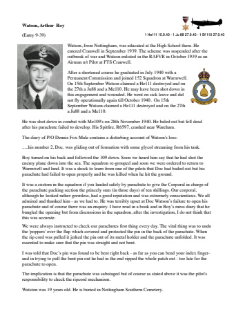 Watson, Arthur%u00a0%u00a0Roy(Entry 9-39)Watson, from Nottingham, was educated at the High School there. He entered Cranwell in September 1939. The scheme was suspended after the outbreak of war and Watson enlisted in the RAFVR in October 1939 as anAirman u/t Pilot at FTS Cranwell.After a shortened course he graduated in July 1940 with a Permanent Commission and joined 152 Squadron at Warmwell. On 15th September Watson claimed a He111 destroyed and on the 27th a Ju88 and a Me110. He may have been shot down in this engagement and wounded. He went on sick leave and did not fly operationally again till October 1940. On 15th September Watson claimed a He111 destroyed and on the 27th a Ju88 and a Me110. He was shot down in combat with Me109's on 28th November 1940. He baled out but fell dead after his parachute failed to develop. His Spitfire, R6597, crashed near Wareham.The diary of P/O Dennis Fox-Male contains a disturbing account of Watson's loss:.....his number 2, Doc, was gliding out of formation with some glycol streaming from his tank.Boy turned on his back and followed the 109 down. Soon we heard him say that he had shot the enemy plane down into the sea. The squadron re-grouped and soon we were ordered to return to Warmwell and land. It was a shock to learn from one of the pilots that Doc had bailed out but his parachute had failed to open properly and he was killed when he hit the ground.It was a custom in the squadron if you landed safely by parachute to give the Corporal in charge of the parachute packing section the princely sum (in those days) of ten shillings. Our corporal, although he looked rather gormless, had a good reputation and was extremely conscientious. We all admired and thanked him - as we had to. He was terribly upset at Doc Watson%u2019s failure to open his parachute and of course there was an enquiry. I have read in a book and in Boy%u2019s mess diary that he bungled the opening but from discussions in the squadron, after the investigation, I do not think that this was accurate.We were always instructed to check our parachutes first thing every day. The vital thing was to undo the 'poppers' over the flap which covered and protected the pin in the back of the parachute. When the rip cord was pulled it jerked the pin out of its metal holder and the parachute unfolded. It was essential to make sure that the pin was straight and not bent.I was told that Doc%u2019s pin was found to be bent right back - as far as you can bend your index fingerand in trying to pull the bent pin out he had in the end ripped the whole patch out - too late for the parachute to open.The implication is that the parachute was sabotaged but of course as stated above it was the pilot's responsibility to check the ripcord mechanism.Watston was 19 years old. He is buried in Nottingham Southern Cemetery.