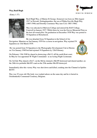 Way, Basil Hugh (Entry 1-37)Basil Hugh Way, of Hinton St George, Somerset was born on 20th August 1917 in Newark, Nottinghamshire, the son of Philip Greville Hugh Way (1865-1946) and Dorothy Constance Way (nee Cave 1883-1966).Way was educated at Malvern College and entered the RAF College, Cranwell in January 1937. Whilst there he won the Groves Memorial Prize as the best all-round pilot. On graduation in December 1938 Way was posted to 54 Squadron at Hornchurch. He was detached from 54 Squadron to the School of Air Navigation, Manston on 2nd January 1939 for a course in navigation. Way rejoined 54 Squadron on 11th March 1939.He was posted from 54 Squadron to the Photographic Development Unit at Heston on 31st January 1940 but had rejoined 54 Squadron by 12th February.On February 13th 1940 he shared in destroying a He111 off the north Kent coast. In May he was appointed 'B' Flight Commander as an Acting Flight Lieutenant. On 3rd July Way shared a Do17, on the 8th he claimed a Me109 destroyed and shared another, on the 24th two probable Me109%u2019s and on the 25th another Me109 destroyed. Immediately after this victory Way was shot down and killed, crashing into the Channel in Spitfire R6707.Way was 22 years old. His body was washed ashore on the same day and he is buried in Oostdunkerke Communal Cemetery, Belgium.